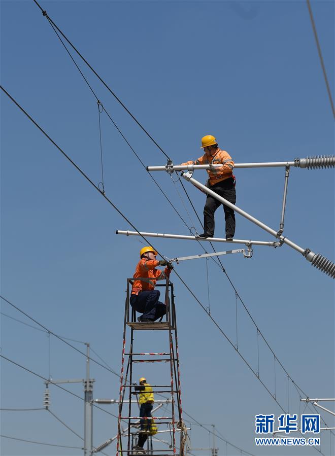 5月12日,中國(guó)鐵路上海局集團(tuán)公司上海高鐵維修段的技術(shù)人員在商合杭高鐵浙江湖州段調(diào)整接觸網(wǎng)導(dǎo)線。近日,商合杭高鐵合肥至湖州段聯(lián)調(diào)聯(lián)試正有條不紊進(jìn)行中。中國(guó)鐵路上海局集團(tuán)公司上海高鐵維修段抽調(diào)49名精兵強(qiáng)將,持續(xù)對(duì)管轄范圍內(nèi)的高鐵線路、信號(hào)、接觸網(wǎng)線進(jìn)行調(diào)試,為下一階段打下基礎(chǔ)。據(jù)了解,商合杭高鐵合湖段聯(lián)調(diào)聯(lián)試之后將轉(zhuǎn)入運(yùn)行試驗(yàn)階段,驗(yàn)收合格并通過(guò)安全評(píng)估后,力爭(zhēng)6月底具備開(kāi)通運(yùn)營(yíng)條件。新華社記者黃宗治攝