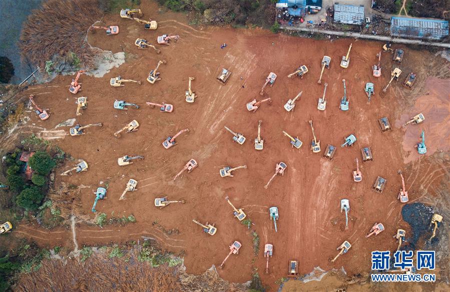 大型機(jī)械在武漢火神山醫(yī)院建設(shè)工地施工(1月24日攝,無(wú)人機(jī)照片)。新華社記者肖藝九攝