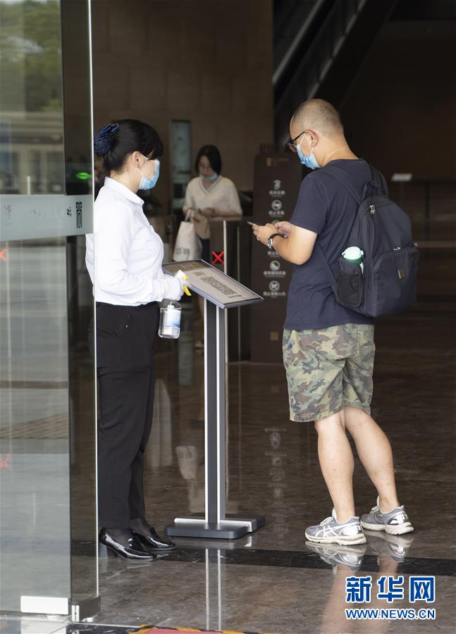 5月17日,在江西省博物館新館,參觀者入館前掃描“健康碼”。江西省博物館新館在做好疫情防控的前提下有序開(kāi)放,公眾可通過(guò)網(wǎng)上預(yù)約參觀游覽。新華社記者張浩波攝
