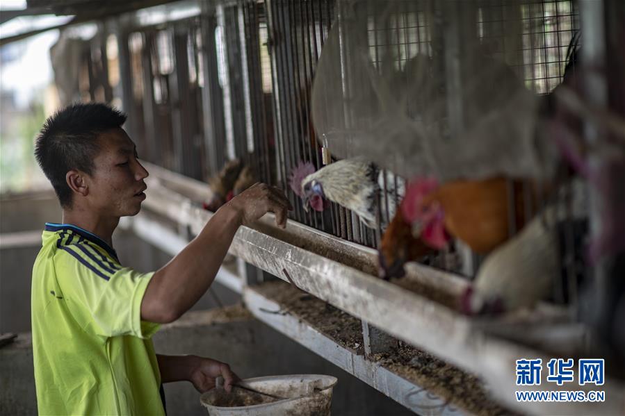 村民在統(tǒng)一修建的雞舍里喂雞(3月28日攝)。新華社記者江文耀攝