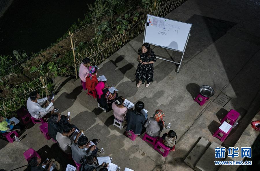 村民們利用夜間空閑時間,在院子里集體學(xué)習(xí)普通話(3月28日攝)。新華社記者江文耀攝