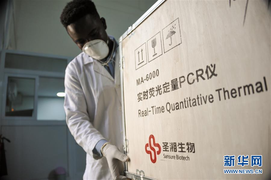 在加納首都阿克拉,加納最大的連鎖藥品供應(yīng)商mPharma的工作人員展示從中國湖南圣湘生物科技股份有限公司進(jìn)口的檢測設(shè)備(2020年5月6日攝)。新華社記者許正攝