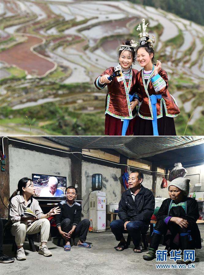 拼版照片上圖:吳賢艷(左)與村里的大一女生梁瓊英在直播推介加榜梯田風(fēng)光(4月19日攝);下圖:吳賢艷(左一)夜訪貧困戶(4月18日攝)。從江縣是貴州省深度貧困縣之一。1994年出生的從江縣侗族女孩吳賢艷在2017年大學(xué)畢業(yè)后回到月亮山區(qū)。2019年3月,她成為從江縣加榜鄉(xiāng)加車村脫貧攻堅指揮所的一名網(wǎng)格員。吳賢艷和其他駐村干部不僅會主動幫助缺少勞動力的農(nóng)戶,還利用閑暇時間通過網(wǎng)絡(luò)平臺,向山外推介美麗的加榜梯田和苗寨風(fēng)光,吸引更多的游客來旅游,為村民們脫貧增收出謀劃策。黨的十八大以來,我們堅持以人民為中心的發(fā)展思想,明確了到2020年我國現(xiàn)行標(biāo)準下農(nóng)村貧困人口實現(xiàn)脫貧、貧困縣全部摘帽、解決區(qū)域性整體貧困的目標(biāo)任務(wù)。目前看,脫貧進度符合預(yù)期,成就舉世矚目。這些成績的取得,凝聚了全黨全國各族人民智慧和心血,是廣大干部群眾扎扎實實干出來的。脫貧摘帽不是終點,而是新生活、新奮斗的起點。新華社記者楊文斌攝