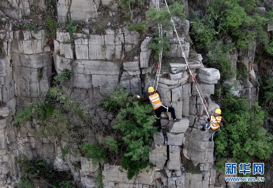 5月21日,捅山工胡軍(左)與張磊互相檢查安全繩捆綁情況。新華社記者郝源攝