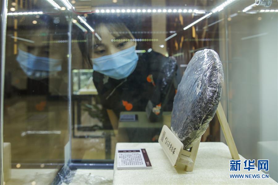5月21日,在位于北京通惠河畔的中華古茶博物館,一名觀眾在首場展覽活動(dòng)——“大道遺真:館藏普洱茶專題展”上觀看一餅“號(hào)級(jí)茶”。 當(dāng)日,以“茶和世界 共品共享——茶,讓我們?cè)谝黄稹睘橹黝}的首個(gè)“國際茶日”萬里茶道系列活動(dòng)在北京中華古茶博物館開啟。 新華社記者 張玉薇 攝