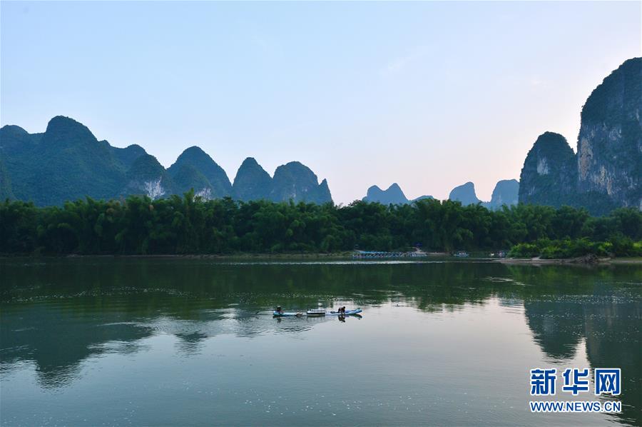 這是在廣西桂林市陽朔縣興坪鎮(zhèn)拍攝的山水風光(5月19日攝)?!吧n蒼森八桂,茲地在湘南。江作青羅帶,山如碧玉篸……”一千多年前,唐朝詩人韓愈寫盡桂林山水之美。初夏時節(jié),在廣西桂林市陽朔縣興坪鎮(zhèn),藍天白云下,煙雨朦朧中,桂林山水盡顯秀美。新華社記者 曹祎銘 攝