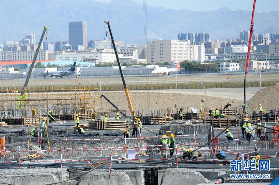 5月23日,工人在烏魯木齊機(jī)場(chǎng)改擴(kuò)建工程施工現(xiàn)場(chǎng)作業(yè)。新華社記者丁磊攝