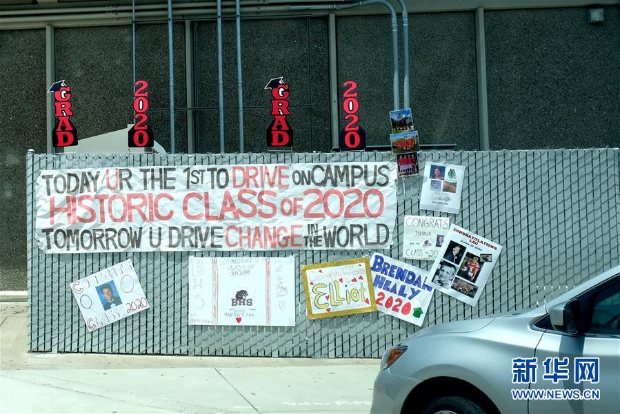 這是5月22日在美國加州北部圣馬特奧縣伯靈格姆高中拍攝的歡迎畢業(yè)生的海報(bào)。新華社記者吳曉凌攝