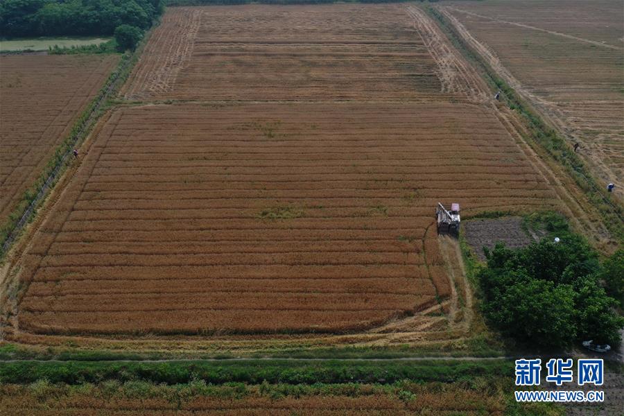5月24日,農(nóng)戶駕駛收割機在浙江省湖州市吳興區(qū)八里店鎮(zhèn)尹家圩糧油植保農(nóng)機專業(yè)合作社的麥田里進行收割作業(yè)(無人機照片)。新華社記者黃宗治攝