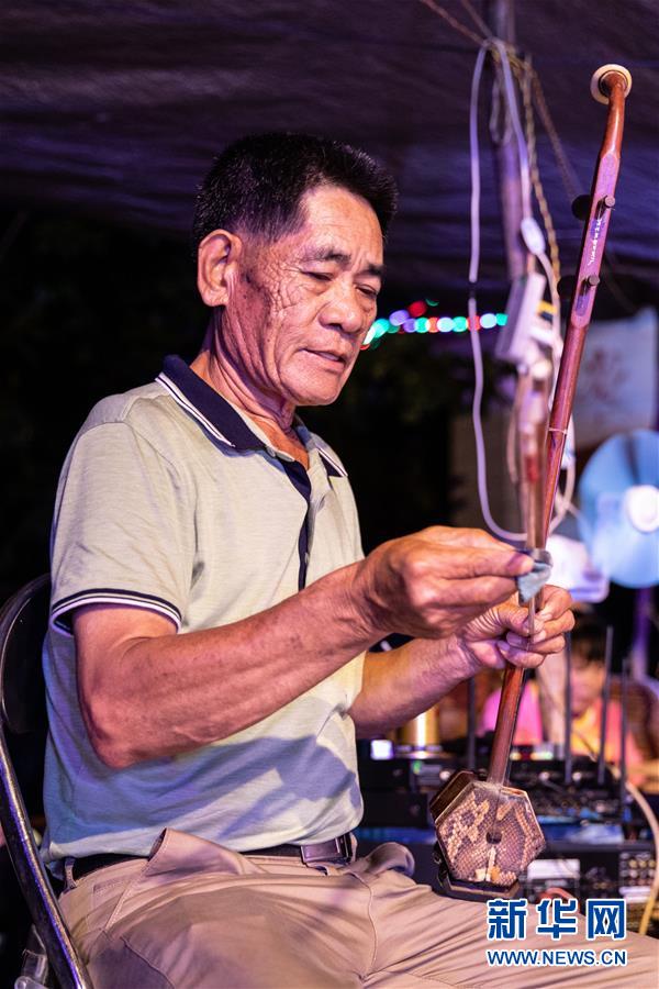 5月24日,海南臨高新風人偶戲團成員在演出前調(diào)試樂器。新華社記者張麗蕓攝