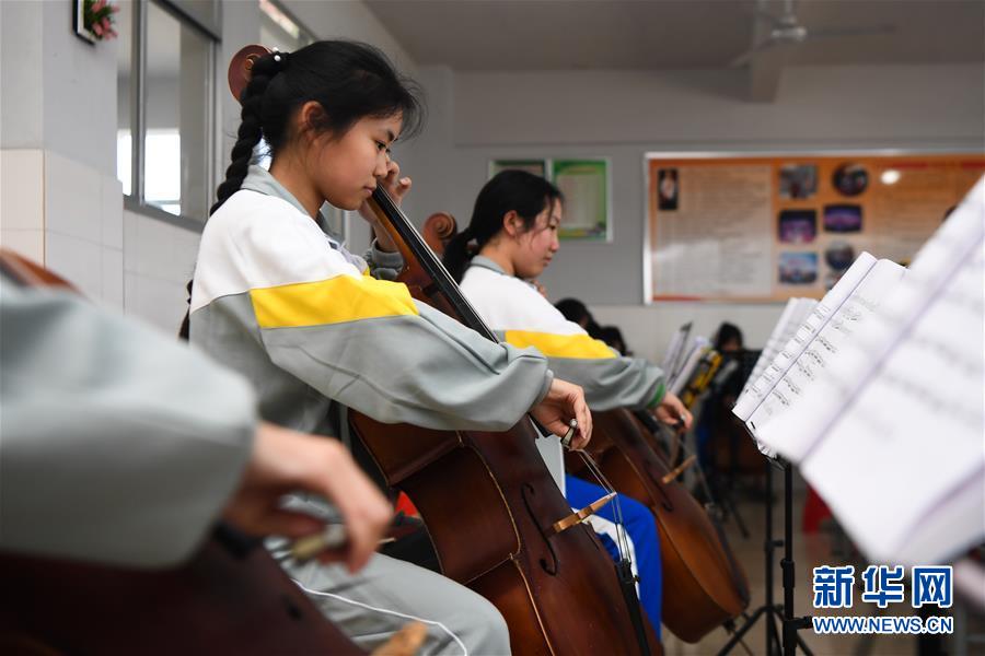 位于湖南省湘西土家族苗族自治州的瀘溪縣第五中學(xué)的學(xué)生在練習(xí)大提琴(5月22日攝)。新華社記者薛宇舸攝