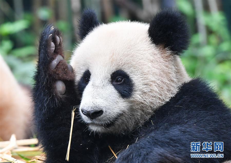 5月27日,被搶走竹子的大熊貓婷仔“舉手”望向飼養(yǎng)員。正在享受竹子大餐的廣州長隆野生動(dòng)物世界大熊貓婷仔被大熊貓隆仔搶食,兩只大熊貓上演一場爭食戲碼。新華社記者劉大偉攝