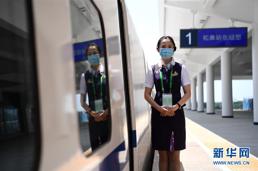 5月27日,試運(yùn)行檢查確認(rèn)列車(chē)乘務(wù)人員在商合杭高鐵柘皋站。新華社記者劉軍喜攝