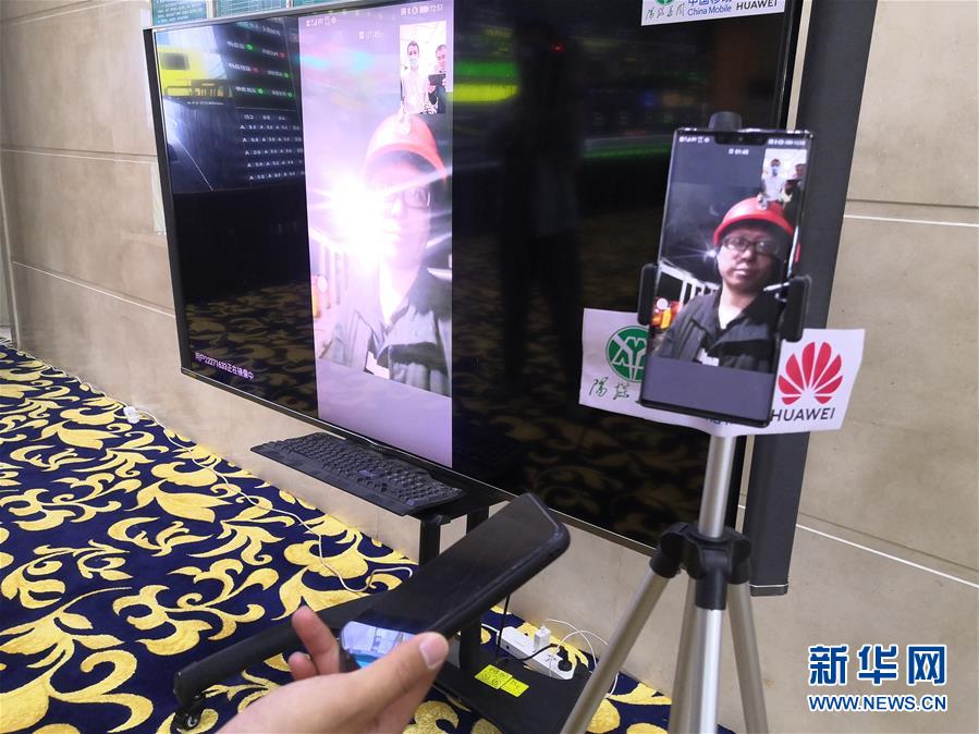在山西陽(yáng)煤集團(tuán)新元煤礦調(diào)度中心,記者通過(guò)5G網(wǎng)絡(luò)視頻采訪井下礦工(5月27日手機(jī)拍攝)。新華社記者梁曉飛攝