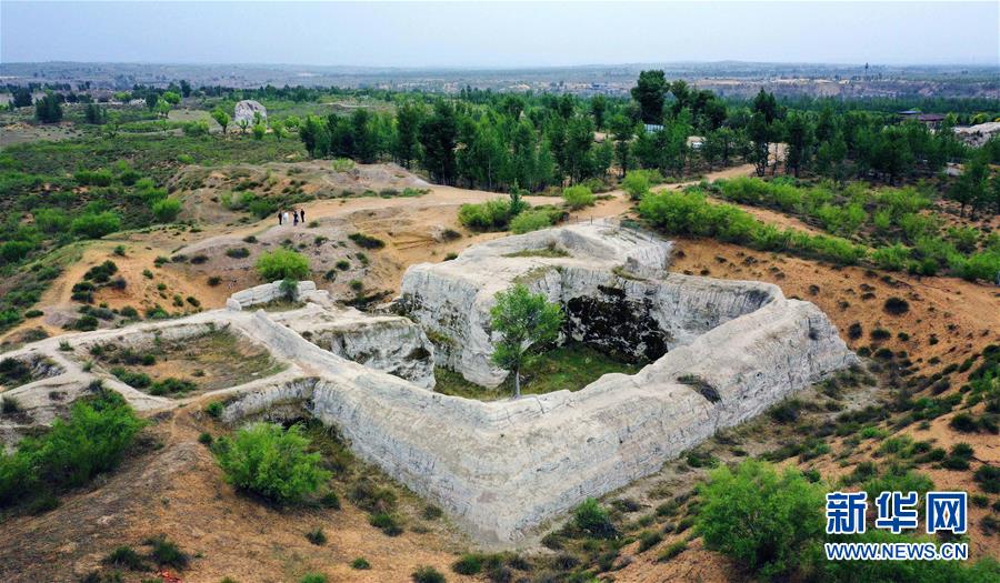 統(tǒng)萬城西南角城臺遺址(5月30日攝,無人機(jī)照片)。新華社記者劉瀟攝