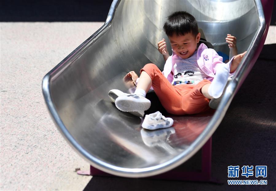 5月31日,小朋友在北京五棵松華熙Live滑滑梯。新華社記者張晨霖攝