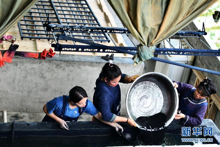 2018年,楊成蘭在村里成立傳統(tǒng)織染合作社,吸引村里及周邊村寨貧困戶入股,帶動當(dāng)?shù)刎毨艉痛迕窦尤牒献魃纾瑥氖驴棽?、染布、藍(lán)靛種植等產(chǎn)業(yè),在傳承民族傳統(tǒng)手工技藝的同時(shí),幫助村民脫貧增收。新華社記者楊文斌攝