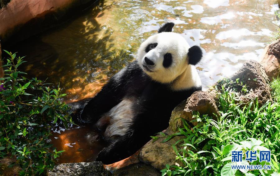 6月1日,大熊貓“貢貢”在水池中休息。
