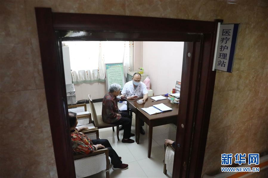 6月1日,在正定縣塔元莊村勁松老年公寓,醫(yī)護人員在醫(yī)療護理站為老人測量血壓。新華社記者朱旭東攝。