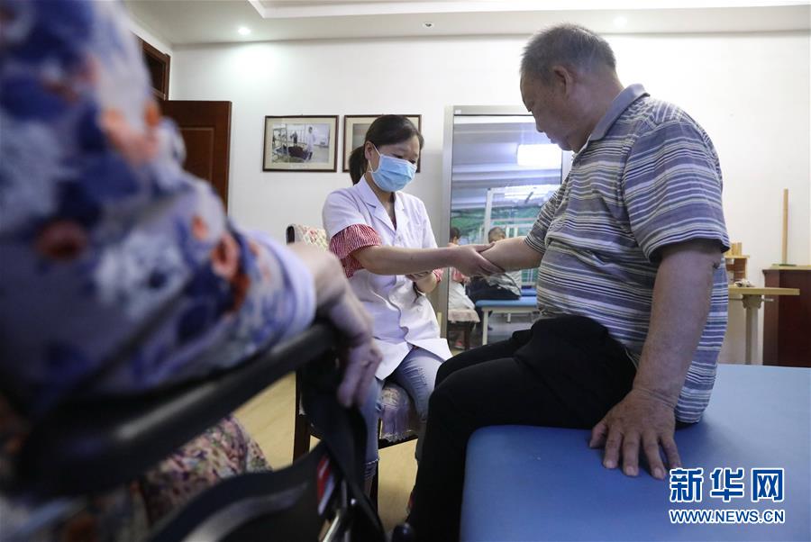 6月1日,在正定縣塔元莊村勁松老年公寓,醫(yī)護人員為老人做康復(fù)按摩。新華社記者朱旭東攝。