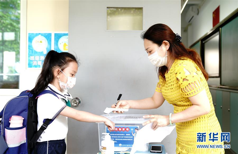 6月2日,上海閔行區(qū)鑫都小學(xué)的學(xué)生走進(jìn)校園。當(dāng)日,上海小學(xué)一、二、三年級(jí)學(xué)生返校開學(xué)。新華社記者張建松攝。