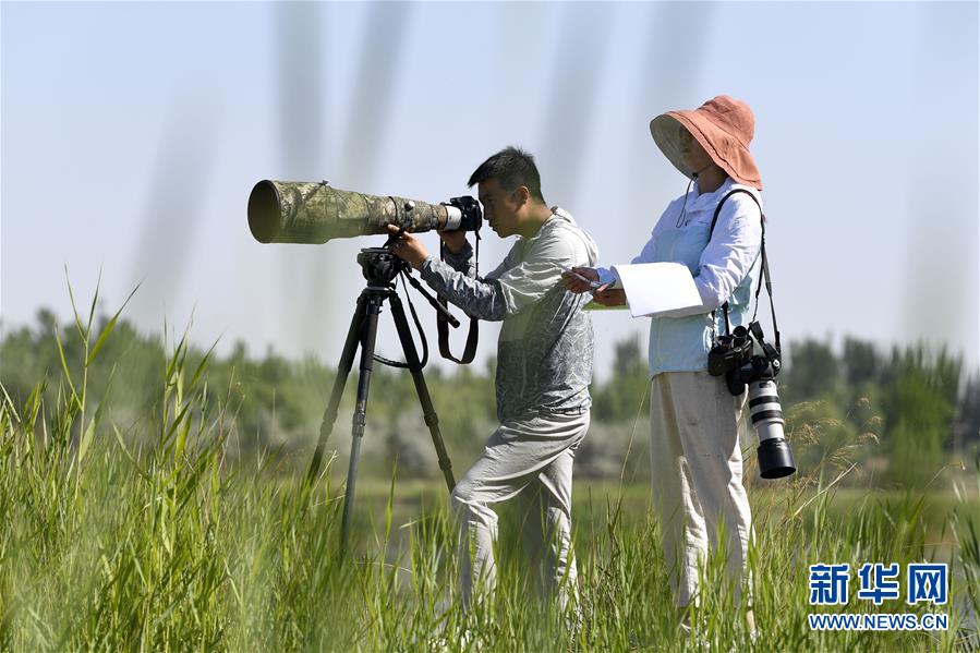 6月3日,李學明(左)和同事張海榮在監(jiān)測記錄黃河濕地的鳥類活動。新華社記者馮開華攝。