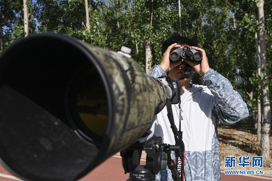 6月3日,李學明利用望遠鏡觀察黃河濕地的鳥類活動。新華社記者馮開華攝。
