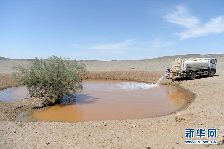 在新疆卡拉麥里山有蹄類(lèi)野生動(dòng)物自然保護(hù)區(qū),管護(hù)員為水源地灌水(6月3日攝)。新華社記者丁磊攝。