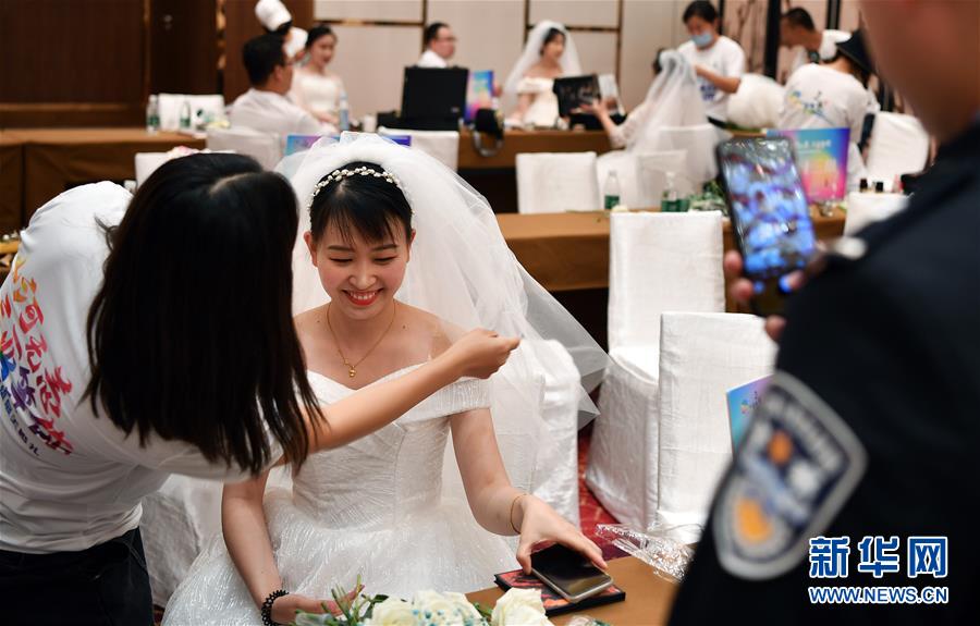 6月6日,海南省萬寧市公安局疫情防控指揮部民警騰凱彪在為正在化妝的妻子侯俊霞拍照。 當(dāng)日,來自全國(guó)15個(gè)省份的百對(duì)新人在三亞市亞特蘭蒂斯度假區(qū)舉行了一場(chǎng)特殊的集體婚禮,每對(duì)新人中至少有一位參與過抗擊新冠肺炎疫情的工作。 新華社記者 郭程 攝