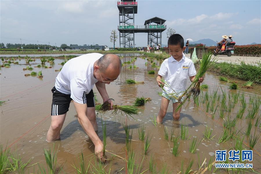6月7日,孩子和家長(zhǎng)在稻田里插秧。新華社記者徐昱攝