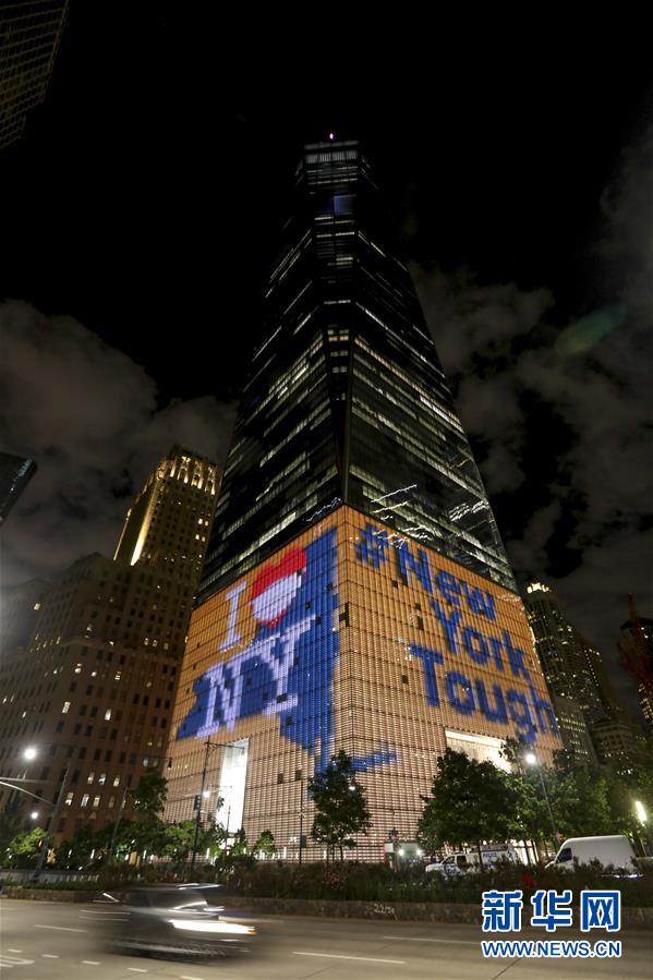 6月7日,美國紐約世貿中心一號樓外墻呈現出“我愛紐約”和“紐約堅強”字樣。新華社記者王迎攝