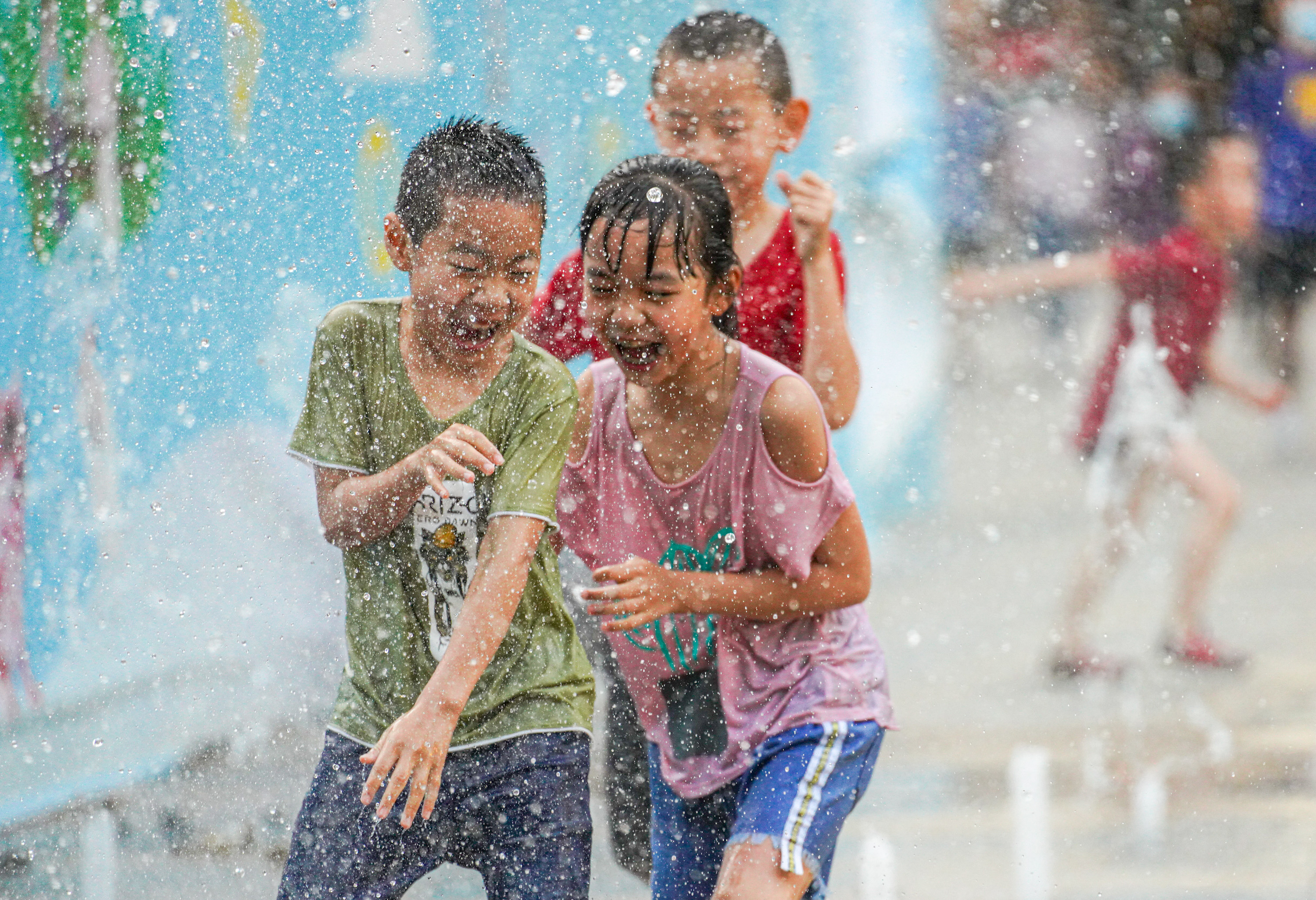 2020年6月9日報道,近期,今年以來最大范圍高溫天氣“炙烤”北方,多地高溫屢創(chuàng)紀錄,中央氣象臺已連續(xù)3天發(fā)布高溫預警,同時,高溫少雨也導致一些地區(qū)出現(xiàn)嚴重旱情。圖為2020年6月4日,北京三里屯噴泉廣場,很多孩子聚集在此,水中玩耍異?;鸨?。