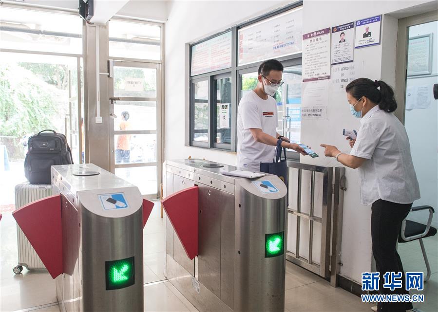 6月8日,在武漢大學(xué),返校學(xué)生掃健康碼以及測體溫后進(jìn)入宿舍。6月8日起,武漢大學(xué)、華中科技大學(xué)、武漢理工大學(xué)、華中師范大學(xué)等多所武漢高校迎來首批返校畢業(yè)生。新華社記者肖藝九攝