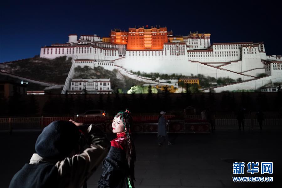 游客在布達拉宮廣場拍照(6月8日攝)。夜幕降臨,西藏拉薩布達拉宮燈光璀璨,夜景迷人。新華社記者詹彥攝