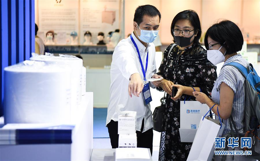 6月10日,一名參展商(左)向采購商講解口罩生產(chǎn)原料及工藝。當(dāng)日,廣州國際防疫物資展覽會在保利世貿(mào)博覽館舉行。本次展會面積共計(jì)3.6萬平方米,設(shè)有防疫產(chǎn)品、設(shè)備、綜合服務(wù)、原輔料等4個展區(qū),參展企業(yè)約600家。新華社記者鄧華攝