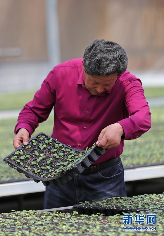在遼寧省盤錦市大洼區(qū)新興鎮(zhèn)坨子里村,劉廣會在自己經營的育苗企業(yè)內查看蔬菜種苗生長情況(6月9日攝)。新華社記者 楊青 攝