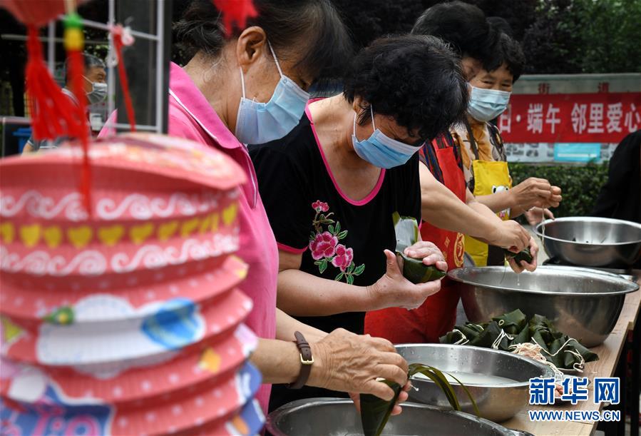 6月17日,水清溝街道居民在社區(qū)廣場上包粽子。當(dāng)日,青島市北區(qū)水清溝街道開展迎端午鄰里愛心傳遞進(jìn)網(wǎng)格活動(dòng),居民通過包粽子、吃粽子、網(wǎng)上端午傳統(tǒng)文化課等形式傳遞鄰里愛心,傳承民俗文化。新華社記者 李紫恒 攝