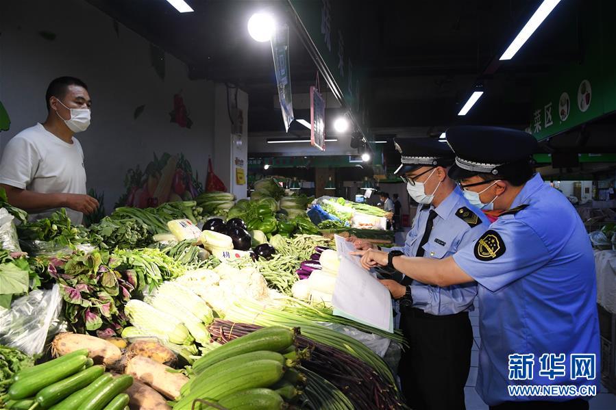 6月17日,在位于北京市海淀區(qū)的增光鴻運市場,執(zhí)法人員對商戶所售蔬菜的進貨渠道進行檢查。新華社記者 任超 攝