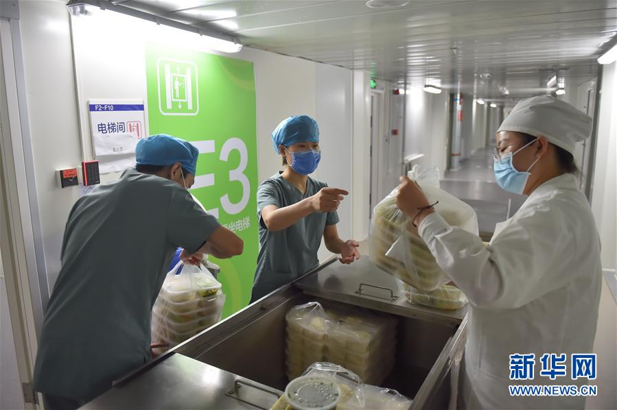6月19日,在北京地壇醫(yī)院隔離病區(qū)外,護士為病人取餐。新華社記者彭子洋攝