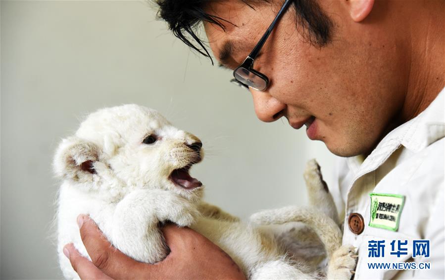 6月14日,濟南野生動物世界飼養(yǎng)員何樹寶與一只滿月小白獅在一起。新華社記者王凱攝