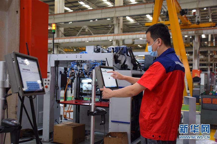天津長榮科技集團股份有限公司的工人在查看生產情況(6月18日攝)。新華社記者白佳麗攝