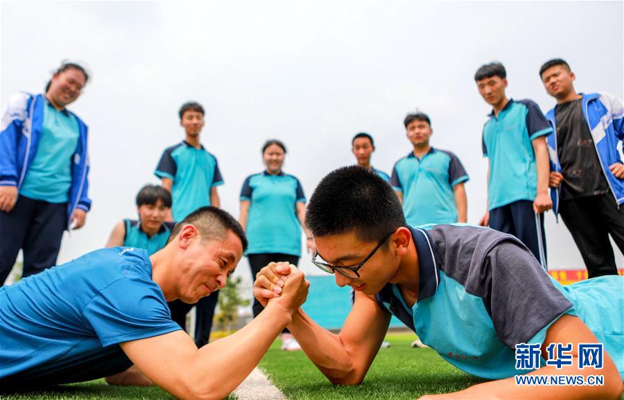 6月22日,河北省邯鄲市邯山區(qū)第一中學的高三學生和老師進行“掰手腕”游戲。2020年高考臨近,河北省邯鄲市邯山區(qū)第一中學在積極做好高三學生復習備考的同時,開展多種形式的減壓活動,幫助學生釋放緊張情緒。新華社記者王曉攝
