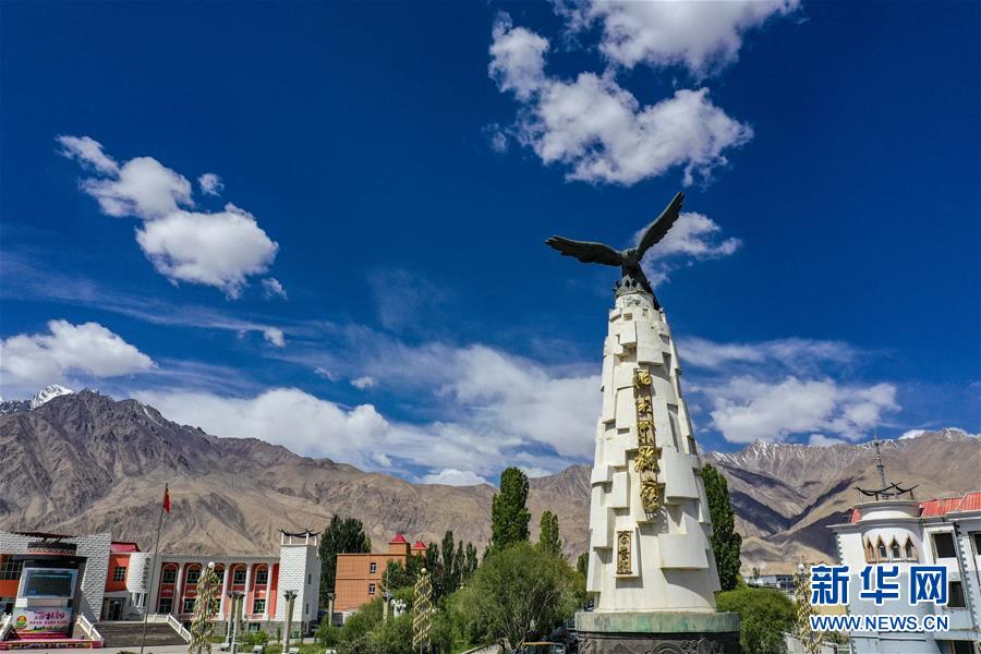 這是位于新疆塔什庫爾干塔吉克自治縣縣城的“帕米爾雄鷹”雕塑(6月20日攝,無人機照片)。新華社記者胡虎虎攝