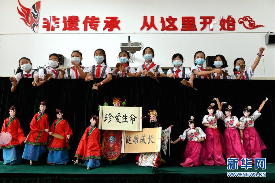 6月22日,連城縣實驗小學學生展演連城提線木偶戲,開展禁毒宣傳活動。在“6·26”國際禁毒日來臨之際,福建省連城縣城鄉(xiāng)小學學生將提線木偶、雕版印刷及傳統(tǒng)花燈等當?shù)乜图曳沁z文化元素,融入校園禁毒宣傳活動中,提高防毒、拒毒和禁毒意識。新華社記者彭張青攝