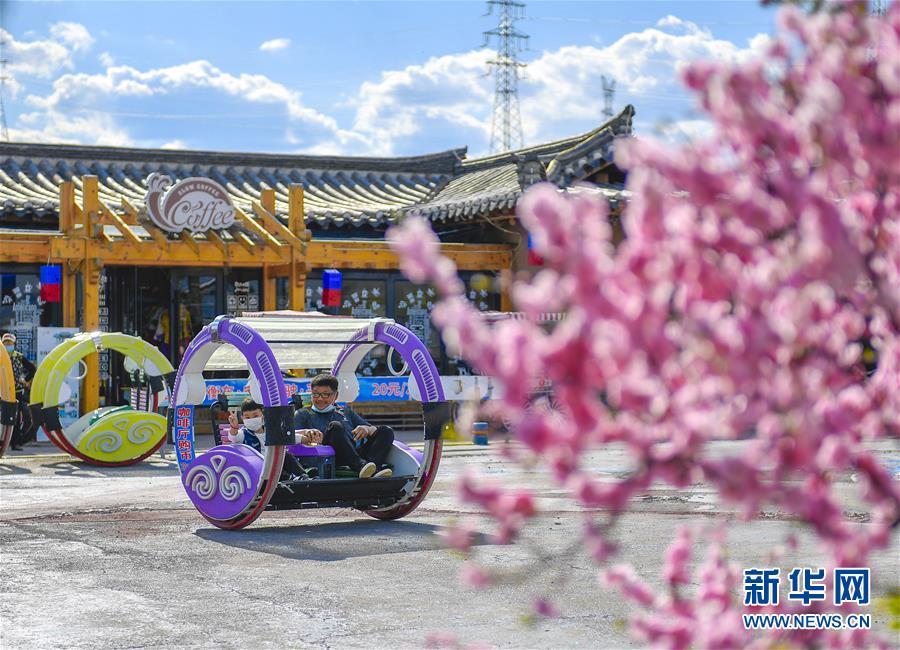 在吉林省延邊朝鮮族自治州和龍市西城鎮(zhèn)金達萊民俗村,村民在村內(nèi)的咖啡館前體驗親子游樂項目(5月6日攝)。新華社記者許暢攝