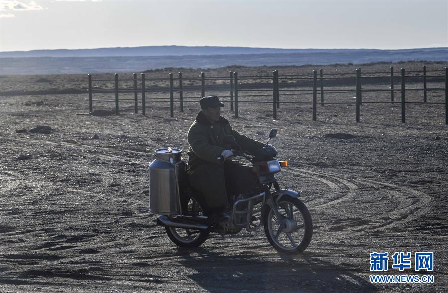 在吉木乃縣萬駝園內(nèi),傍晚時分,牧民米拉木別克·阿依提克準(zhǔn)備騎著摩托車將駱駝趕回圈內(nèi)(6月21日攝)。