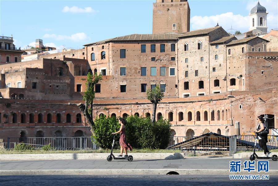 6月23日,在意大利首都羅馬,人們騎著電動(dòng)踏板車在城市中穿行。新華社記者程婷婷攝