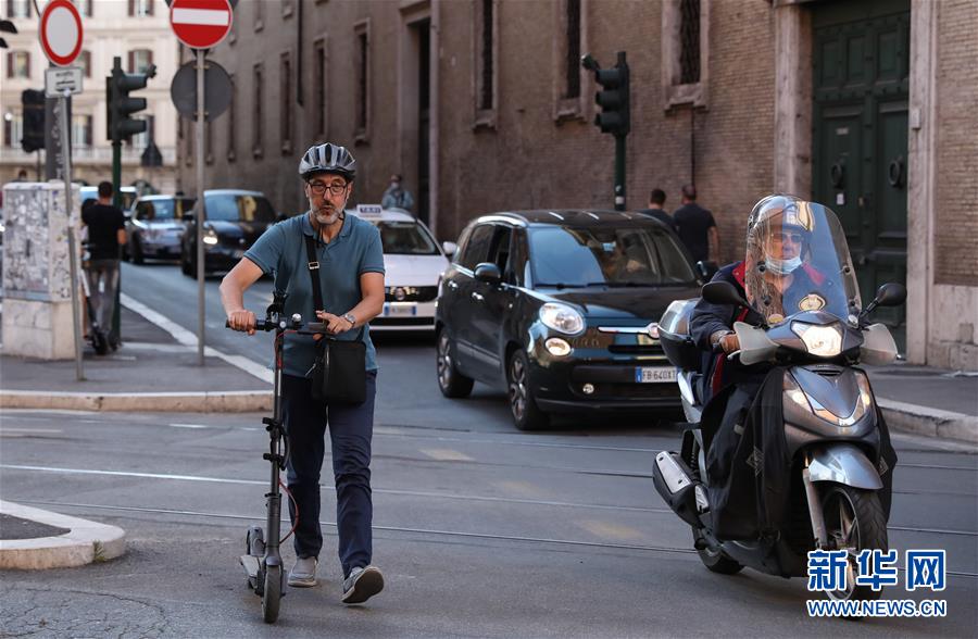 6月23日,在意大利首都羅馬,一名男子推著電動踏板車過馬路。新華社記者程婷婷攝