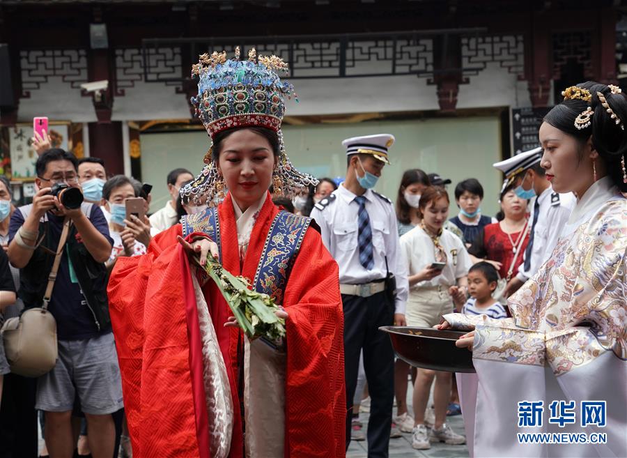 6月24日,在上海豫園舉辦的端午花神國風廟會上,身著古裝的演員在表演。端午節(jié)臨近,各地舉行包粽子、做香包、賽龍舟等豐富多彩的民俗文化活動,迎接傳統(tǒng)佳節(jié)的到來。新華社記者劉穎攝