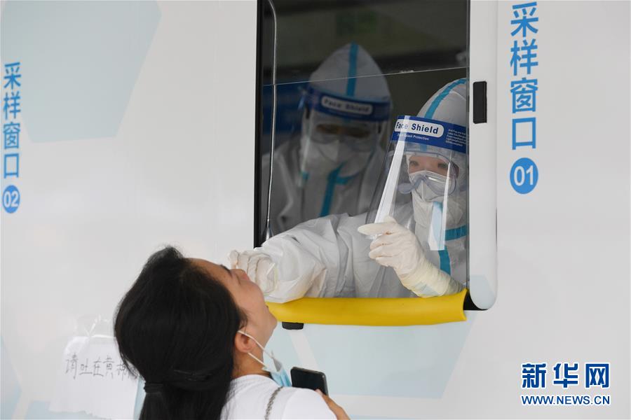 6月28日,在北京市西城區(qū)北京展覽館南側(cè)的露天廣場核酸檢測采樣點,核酸檢測采樣車內(nèi)的醫(yī)護(hù)人員為前來做檢測的人員進(jìn)行采樣。新華社記者鞠煥宗攝